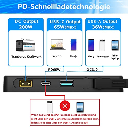[Compatibile e versatile per la maggior parte degli alimentatori portatili] Il caricabatterie a pannello solare è compatibile con la maggior parte delle centrali elettriche e dei generatori. L'uscita DC 21 V/9,5 A è versatile per la maggior parte degli alimentatori portatili. Vari connettori DC e cavi sono inclusi.
