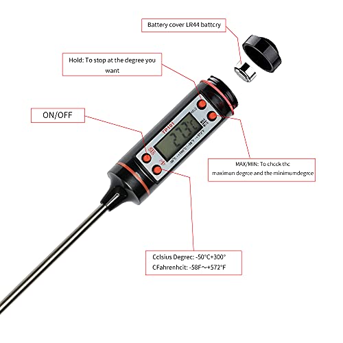 ★ Cosa ottieni: 1 × termometro da cucina digitale. La batteria è inclusa con questo prodotto. 1 × manuale utente e guida alla temperatura. Se c'è un problema con il prodotto, contattaci semplicemente via e-mail per uno scambio o un rimborso.
