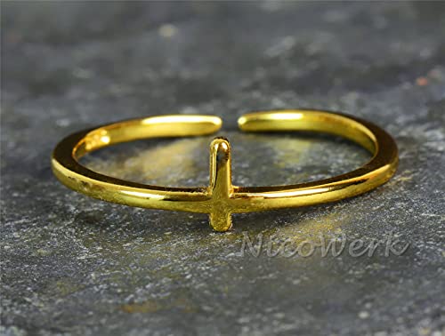 NicoWerk Anello da donna in argento sterling 925, con croce dorata, sottile, liscio, regolabile, SRI706