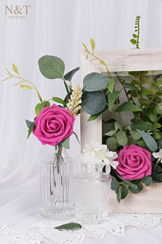 N&T NIETING Fiori Rosa Artificiali,25 Pezzi Schiuma Teste di Rose Finte Aspetto Reale con Foglia e Gambo Regolabile per DIY Matrimoni Mazzi Nuziale Festa Casa Stanza Decorazioni (rosa acceso)