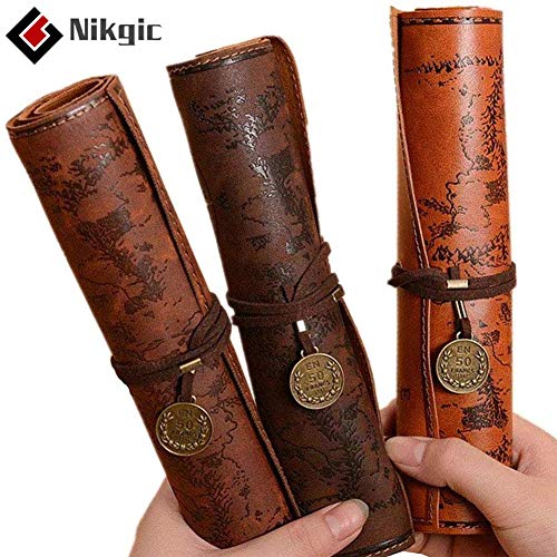 Nikgic Astuccio arrotolabile in stile vintage, a forma di mappa del tesoro, in pelle sintetica, ideale per penne, matite o come porta trucchi