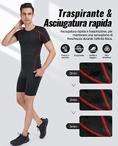 Niksa 2 Pezzi Fitness T-Shirt Maglia Compressione Uomo Maniche Corte Asciugatura Rapida Maglia da Sport per Corsa, Palestra 1053 Nero e Rosso+Marina(XXL)