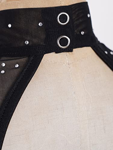 Tuta lunga con scollo a lupetto, senza maniche, schiena scoperta, patchwork in rete, finti diamanti ornati