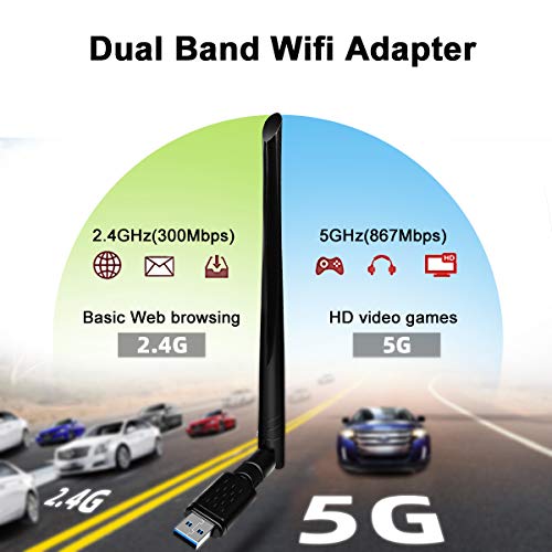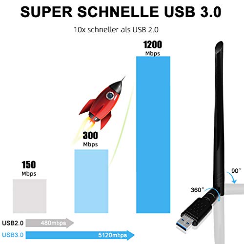 NINECY - Chiavetta WLAN, 1200 Mbit/s Dual Band (5G/867Mbps+2.4G/300Mbps) adattatore WiFi USB 3.0 WiFi Dongle Wireless ricevitore WLAN con antenna 5dBi per Windows/Mac OS/Desktop/Laptop/Notebook