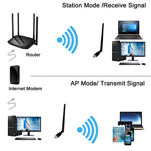 【 Riceve e Invia WiFi】 Modalità AP: collegare l'adattatore in un computer collegato e passare la modalità all'AP, quindi è possibile utilizzare il router Wi-Fi e inviare il segnale. Modalità di stazione: questo adattatore WiFi può essere utilizzato in modalità stazione su computer e laptop come ricevitore di segnale per liberarsi dalle connessioni cablate.