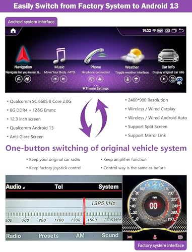Supporta la funzione originale: la schermata di aggiornamento mantiene tutte le funzioni originali, come Autoradio originale, funzione amplificatore, controllo joystick di fabbrica, telecamera posteriore originale e retromarcia, ecc. Non vengono apportate modifiche al software alle unità di controllo del veicolo.