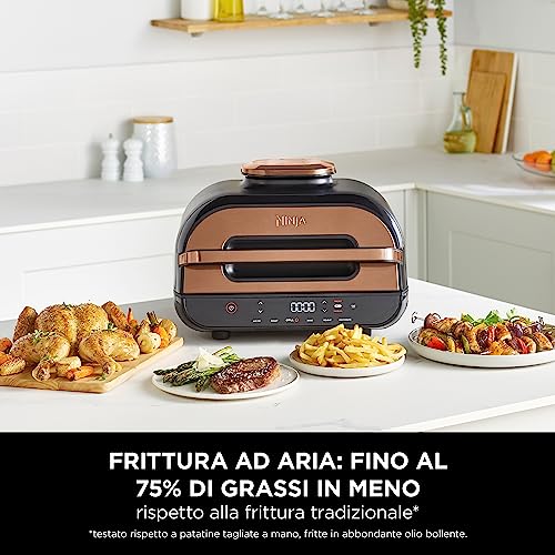INCLUDE: Ninja Foodi Max Grill & Friggitrice ad Aria (spina UE), ferri da spiedo, griglia per arrostire, guanti in silicone, pentola da 3,8 l, cestello per frittura da 3,8 l, piastra da 740 cm2, sonda, spazzola per la pulizia, guida alle ricette. Colore: Rame/Nero
