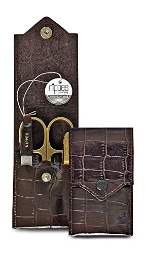 Nippes Solingen Premium Line - Set per manicure Croco, 3 pezzi, placcato in nichel e dorato, per la cura delle unghie, in pelle bovina con design coccodrillo, prodotto in Germania