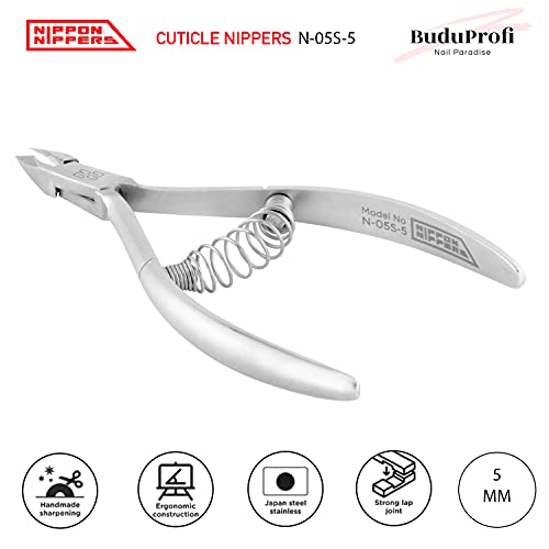 Nippon Nippers, Pinze professionali per cuticole, 5 mm, in lega giapponese, affilatura manuale, manicure pedicure, 115 mm, molle a spirale, N-05S-5