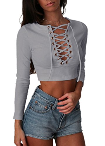 NiSeng Donna V-Neck Crop Top t shirt Manica Lunga da Croce Bandage Profondo V Sweatshirt Top Autunno Grigio M