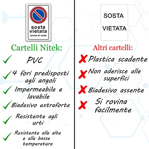Nitek cartello sosta vietata anche di notte in pvc 30cm x 20cm - Cartello autoadesivo| Sign, Schild | Impermeabili Lavabili, proprietà private, garage, cancelli