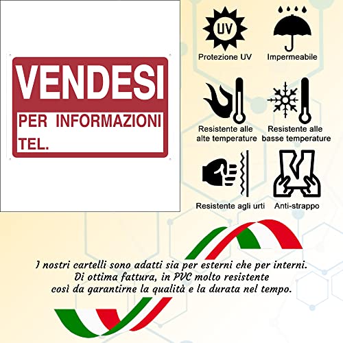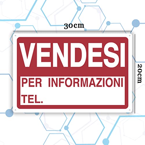 ✅CARATTERISTICHE: Cartello adesivo “Vendesi” in PVC, che si presenta nel seguente modo: nella parte superiore abbiamo un sfondo rosso con il seguente testo bianco al suo interno: “VENDESI”, mentre nella parte inferiore troviamo un riquadro con i bordi rossi, lo sfondo bianco e il seguente testo rosso al suo interno: “PER INFORMAZIONI” - “TEL.”. Dimensioni 30cm x 20cm x 1 mm.