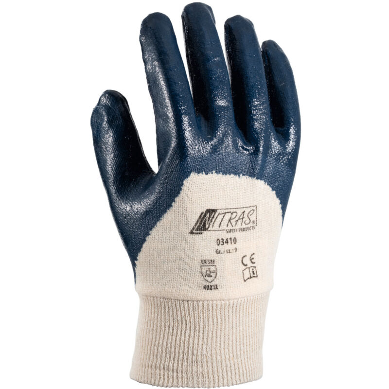 Guanto robusto in jersey di cotone con rivestimento in nitrile per impieghi medi e pesanti. Durata nettamente maggiore rispetto a quella dei guanti pesanti in pelle, nonché più robusti e più flessibili rispetto ai guanti in PVC. Efficace barriera al grasso e all'olio. Particolarmente adatto per pezzi fusi grezzi, pezzi di formatura in plastica, laminati, lamiere, cavi ad alte prestazioni, materiali da costruzione, legno grezzo. 03410. Con manichetta in tela e rivestimento 3/4 per una migliore traspirabilità. Norma: EN 388;