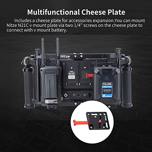 【Piastra di Formaggio Inclusa】 La camera director monitor cage può essere montata con batteria di montaggio V tramite la piastra di montaggio Nitze V serie N21 per fornire una lunga durata al monitor e ad altri accessori esterni.