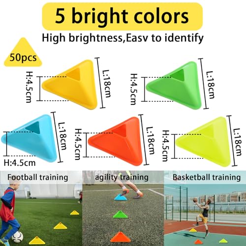 ⚽️Design Robusto e Flessibile: Con il nostro set di 50 coni da allenamento triangolari NIUNIAJ, flessibilità e resistenza si uniscono. Realizzati in PE di alta qualità, questi coni sono progettati per durare, indipendentemente dall'uso intensivo.