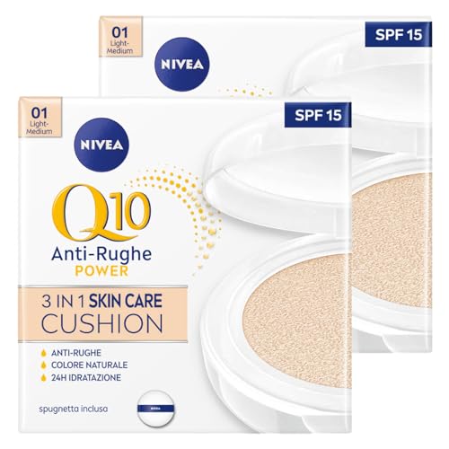Il kit contiene: 2 Confezioni di Nivea Q10 Plus Anti-Age 3in1 Skin Care Fondotinta Cushion 01 Light Medium da 15g