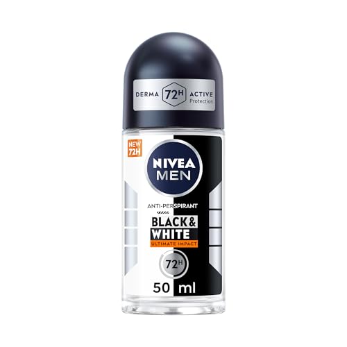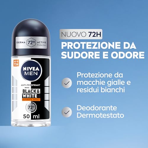 NIVEA MEN Black & White Invisible Ultimate Impact Roll-on 50 ml, Deodorante uomo 72h, Deodorante roll on antitraspirante contro odori, sudore, residui, irritazioni e macchie su tessuti chiari e scuri