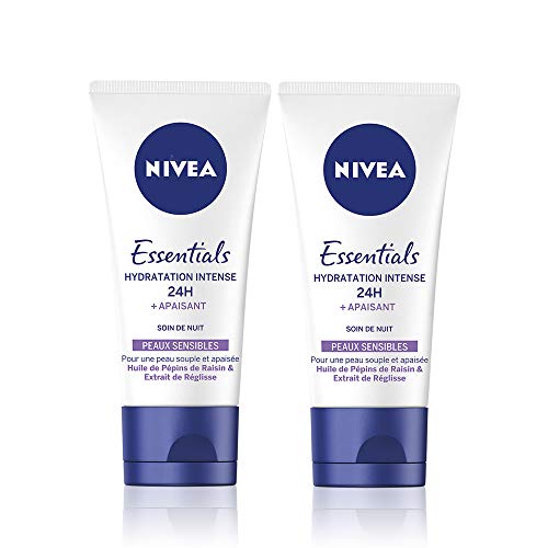 Confezione Nivea - Trattamento di notte Essentials 24H idratazione intensa + lenitiva per pelli sensibili, tubo di crema Nivea 2 x 50 ml, numero articolo: 82348.
