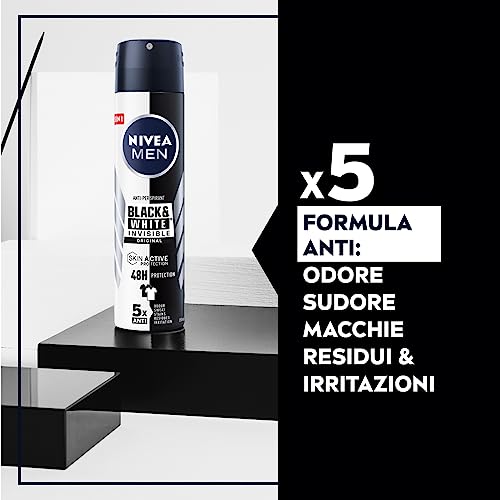 Nivea Men Deodorante Spray Black & White Invisible Original offre una protezione duratura con una piacevole sensazione di pelle fresca per 48 ore. Non lascia residui sui capi