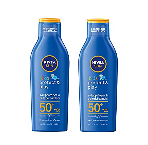 NIVEA SUN Latte Solare Kids Protect & Care SPF 50+ 2 x 200 ml, Protezione solare per bambini estremamente resistente all'acqua, Crema solare bambini dai 3 anni in su