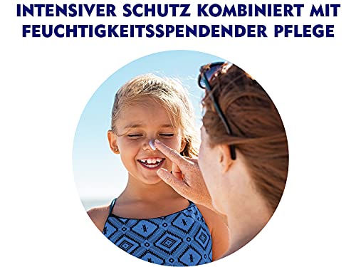 Contenuto della confezione: spray solare Nivea Sun Kids Protect & Sensitiv in confezione da 1 pezzo, 1 flacone da 200 ml, con dimensione da viaggio (50 ml), codice articolo 85847
