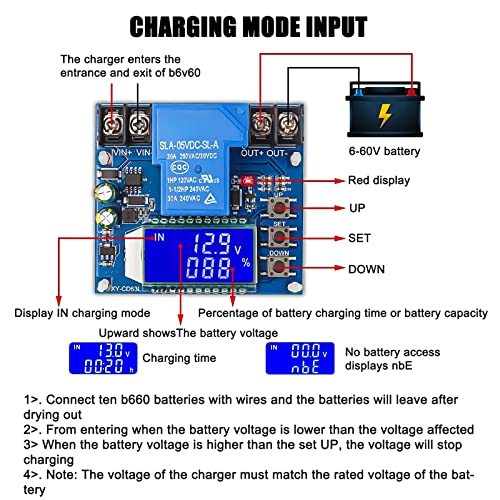 Corrente DC 6 V-60 V, 30 A e ritardo di accensione: monitor batteria con relè ad alta corrente da 30 A, adatto per qualsiasi varietà di batterie e batterie al litio da 6-60 V. Dopo una carica o scarica, l'intervallo tra la riaccensione. L'intervallo di tempo regolabile è di 0-999 secondi.
