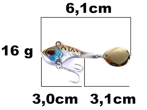 Lanci larghi: il wobbler Crankbait con lama spinner è estremamente pesante per le sue dimensioni e quindi perfetto per lanci lunghi. Soprattutto nella stagione fredda, i pesci bersaglio sono spesso lontani dalla riva e irraggiungibili con le solite esche. L'esca perfetta per l'autunno e l'inverno