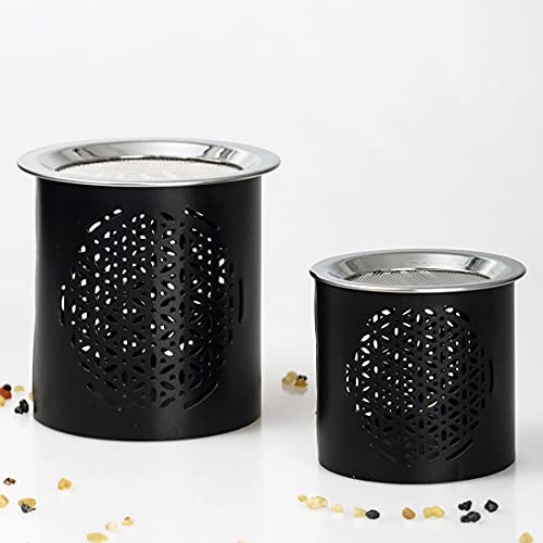 Il bruciatore di incenso è realizzato in ferro e di colore nero opaco. L'altezza del bruciaincenso è di 6 cm. Il suo diametro è di 7 cm. Il fiore della vita è inciso sulla superficie.