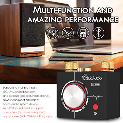 Supporta più ingressi (RCA /3,5mm/USB/Bluetooth) e uscite (altoparlanti/cuffie). La porta USB può supportare computer (nessun driver necessario) e telefoni (con funzione OTG).