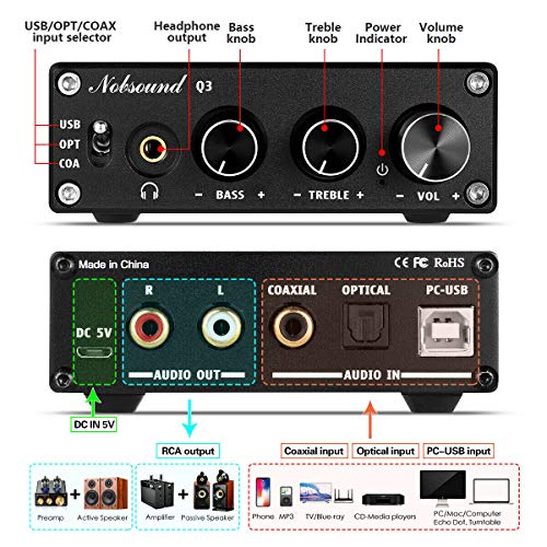 Nobsound Audio Q3 - Amplificatore per cuffie mini stereo DAC USB/ottico/coassiale a RCA AUX 24 bit/192 kHz digitale ad analogico, per home theater/TV