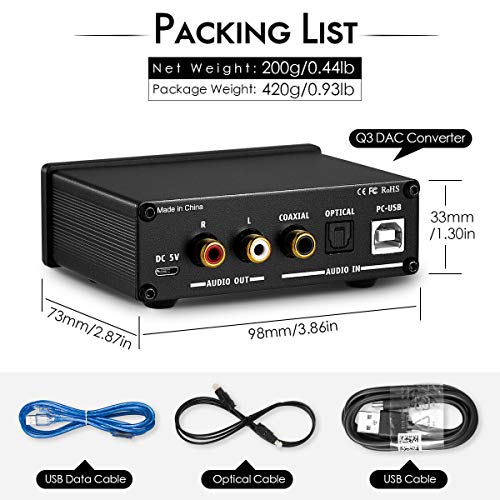 Il PC USB è plug and play, non è necessario per qualsiasi driver, può processare audio digitale a qualsiasi bit di profondità fino a 24 bit e qualsiasi velocità di campionamento fino a 96 KHz con rapporto di rumore elevato e bassa distortione. L'uscita delle cuffie ad alte prestazioni è progettata per un'ampia gamma di cuffie.