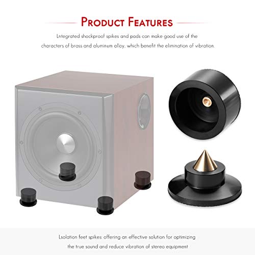 Funzione: utilizzare le punte di isolamento per interrompere il riaccoppiamento acustico degli altoparlanti. Le punte possono essere installate per separare i vostri lettori, amplificatori o altri componenti audio dalle vibrazioni. I toni diventano più focalizzati e più silenziosi.
