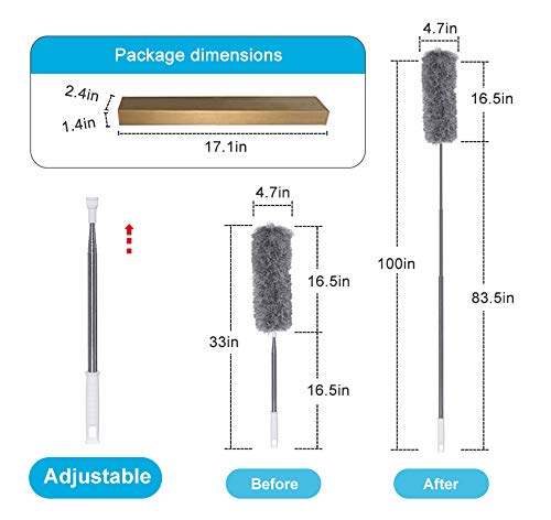 Qualità premium: il manico telescopico è realizzato in acciaio inossidabile di alta qualità, antiruggine e liscio, non graffia mai le mani. La testina lavabile, realizzata in morbida microfibra ad assorbimento elettrostatico, assorbe saldamente la polvere e i capelli. Consentire lunga alta qualità e tempo di utilizzo stabile.