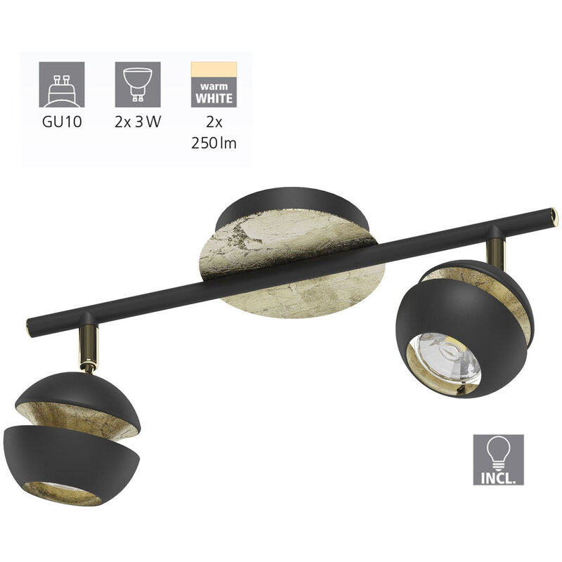 EGLO NOCITO- Spot Nocito in nero, oro 2x4W L: 36cm Pagina 2-spot NOCITO ispira al design speciale di acciaio nero e oro bordato ed è dotato di due LED-lampade GU10 dotata lunghezza in cm 36 altezza in cm:. 0 diametro in cm: 0 peso in kg: 1.025 tipo di lampadina: max GU10 LED . Watt Lampadina: incluso 2X3,3W lampada: INCLUSO Classe di efficienza energetica: A + protezione: IP20 Switch: nessun interruttore dimmerabile: luminosa flux: materiale caso: acciaio di colore del corpo: nero, oro materiale di vetro / schermo: vetro colore / schermo: ulteriori informazioni
