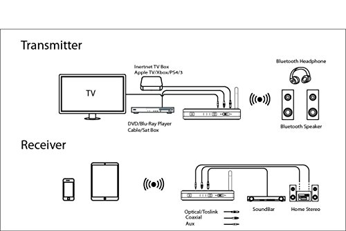 Fornisce a lungo raggio, bassa latenza, suono la chiarezza con Toslink audio digitale HD, SPDIF input / output. Espandi la tua TV, sistemi home theatre per trasmettere o ricevere la musica HD / audio in modalità wireless. Lavori per la TV, Internet TV box, Amazon Fuoco TV, Apple TV, Roku, Xbox, PS3 / 4, Gaming, lettore Blu -Ray, decoder via cavo / sat, lettore musicale, CD, lettore sorgente audio e iPad, iPhone, iPod, Samsung, Bluetooth consentono MP3 e altro ancora.