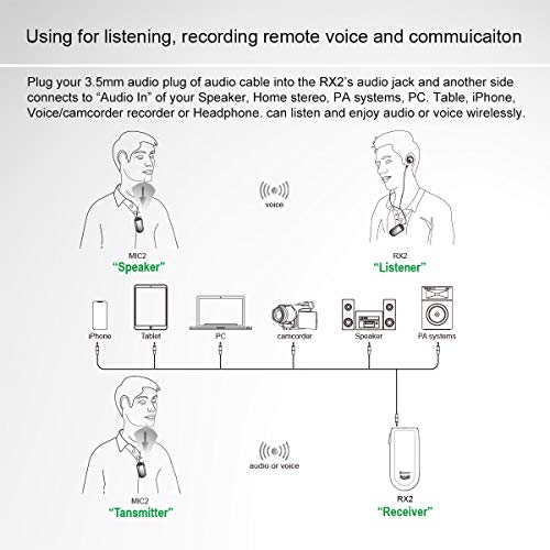 Funzionamento a lunga distanza gamma fino a 20m (66 ft) è buono per aula, sala da ballo, sala riunioni, ufficio, casa, all'aperto e ascoltare a distanza dei sistemi. Integrato con una batteria ricaricabile da fornisce fino a 6 ore di funzionamento in conversazione