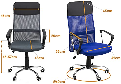 Imbottitura in microgriglia per migliorare la circolazione dell'aria. Bracciolo in plastica nera rinforzato con acciaio cromato a cinque stelle base cromata in metallo con ruote gommate