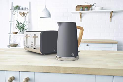 Swan Nordic Set Colazione Bollitore Wireless 1,7 L 2200 W, Tostapane Pane, Slot Ampia, 4 fette, 3 funzioni, Design moderno, Effetto Legno, Grigio