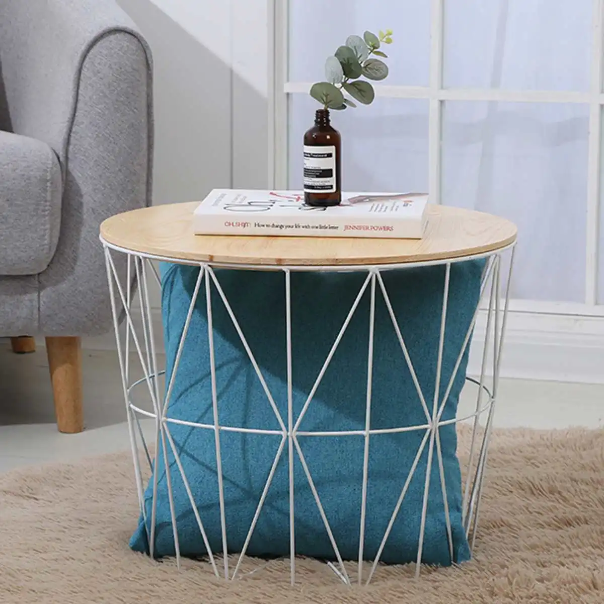 Nordic White Black Iron Metal Coffee Table Dirty Storage Basket with Wooden Top Tea Fruit Snack Plate Tray Living Room Sofa Side