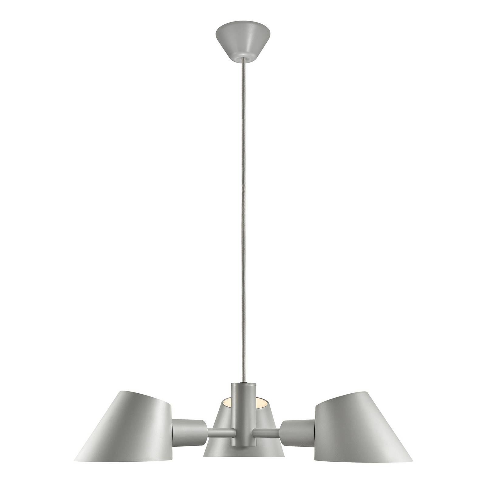 Apparecchio a sospensione a tre lampade Stay in look scandinavo La lampada a sospensione in alluminio è stata disegnata da Maria Berntsen e porta l'atmosfera danese nel soggiorno e nella sala da pranzo. I tre paralumi a forma di cono sono aperti in alto e in basso e forniscono un'illuminazione ad ampio raggio che si irradia anche verso l'alto. Il trio è collegato al baldacchino rotondo del soffitto con un cavo tessile. Tre portalampade ospitano le lampade corrispondenti, che possono essere ordinate direttamente dagli accessori. L'aspetto nordico è generato dalla superficie unicolore e opaca dell'apparecchio e si adatta perfettamente a molti interni.