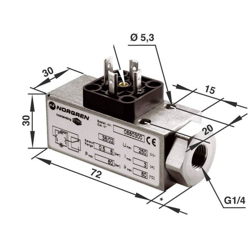 Dettagli tecnici Modello (in generale) Per aria compressa Tipo prodotto Pressostato Riproducibilità: ±3 %, per vuoto ±4 % Numero di commutazioni: 100/min Tipo di protezione IP65 Materiale alloggiamento: alluminio Incluso nella consegna null Requisiti di sistema null Note A temperature inferiori a +2 °C si prega tenere sotto controllo la qualità dell'aria. Illustration similar.