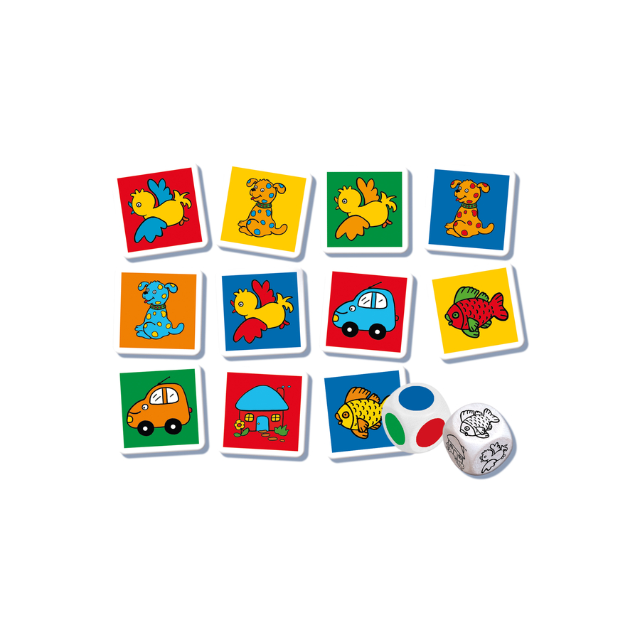 Dettagli del prodotto: Età: da 4 anni Il gioco di reazione veloce Cinque diversi motivi sono rappresentati sulle 25 carte: Il pesce, l'uccello, il cane, la casa e la macchina. Questi cinque motivi sono anche sui dadi. Così, quando un giocatore tira il cane, deve anche trovare una carta con un cane. Il dado del colore determina il colore dello sfondo su cui ogni motivo è posto Gioco di reazione per 2-6 giochi Dimensioni e peso: Dimensioni (lunghezza x larghezza x altezza): 21 x 21 x 4,5 cm Peso: 0,31 kg