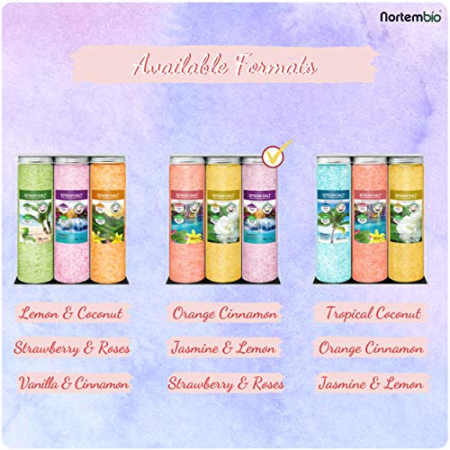 Nortembio Sali di Epsom Pack 3 x 430 g. Fragranze di Cannella, Gelsomino, Rose. Idratati con Vitamina C ed E. Sali da Bagno Profumati, Aromaterapia, Terapie di Galleggiamento. E-Book Incluso.