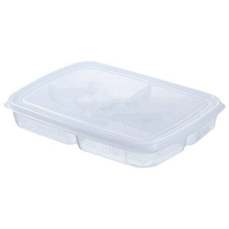 Una scatola portaoggetti intelligente in plastica di qualità alimentare, perfetta per conservare gli alimenti nel frigorifero. La scatola portaoggetti ha 4 scomparti che ti permettono di riporre facilmente diversi tipi di alimenti nella scatola senza rischiarli insieme. Grazie a un coperchio intelligente, la scatola rimane ermetica, mantenendo freschi sia il frigorifero che il cibo. La scatola portaoggetti resiste alle basse temperature e può essere utilizzata più volte. - Contenitore per alimenti - 4 scomparti - resiste alle basse temperature Specifiche: Colore: trasparente Materiale: polipropilene Dimensioni: 21 x 15,5 x 3,5 cm