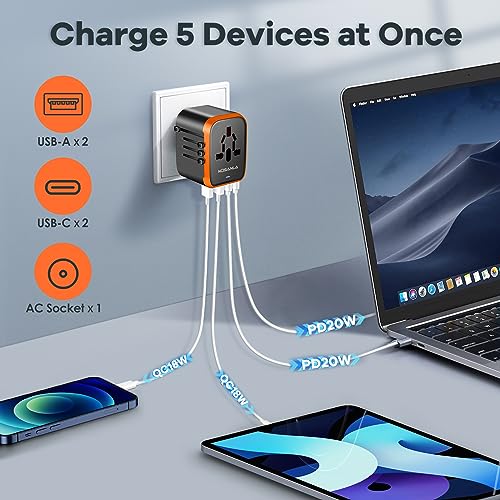 Carica 5 dispositivi contemporaneamente - Il nostro adattatore di corrente da viaggio dispone di 2 porte USB-A (18W) e 2 porte USB-C (20W), consentendoti di caricare fino a cinque dispositivi contemporaneamente. Dì addio a cavi ingarbugliati e prese limitate!
