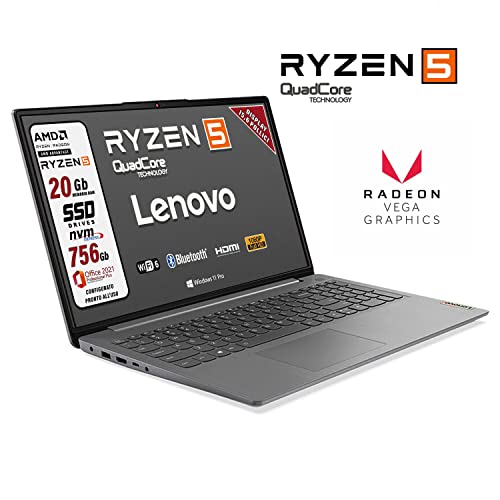 Notebook Lenovo Ryzen 5 QuadCore fino a 3,7GHz in burst mode, Svga Vega 8, Display da 15,6" FullHD, DDR4 20 GB, SSHD da 756 Gb, Wi-Fi, Bt, Webcam, Win 11 Pro, Office pro, Pronto all'Uso