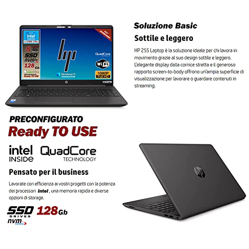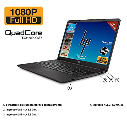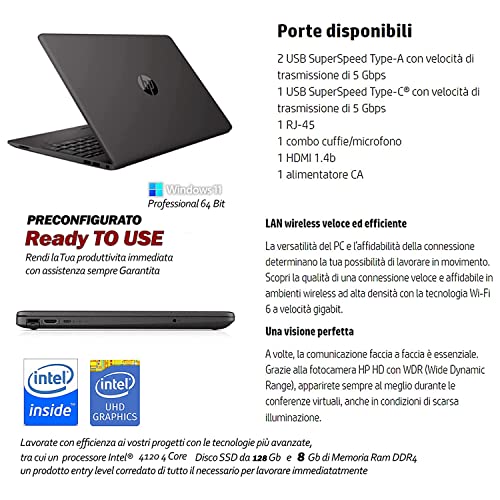 HP 250 G8 Notebook Portatile, Intel 4120 4 Core, SSD da 128 Gb Display Led Full HD 15.6", DDR4 8 Gb, Wi-Fi, 3 usb di cui 1 Type-C, Webcam HD, Win 11 Pro, Libre Office, Pronto all'uso, Gar. Italia