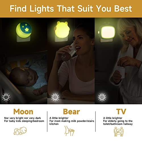 【Scegli buona luce notturna】 2 diverse luminosità tra cui scegliere. La lampada da notte Moon è più scura della lampada Bear e TV, adatta per dormire in camera da letto, nella stanza dei bambini o per le persone a cui non piace la luce notturna troppo luminosa. La luce notturna TV e orso offre una luminosità più ampia al buio, adatta per corridoi, scale, garage, cucine, soggiorni, scantinati, ecc.