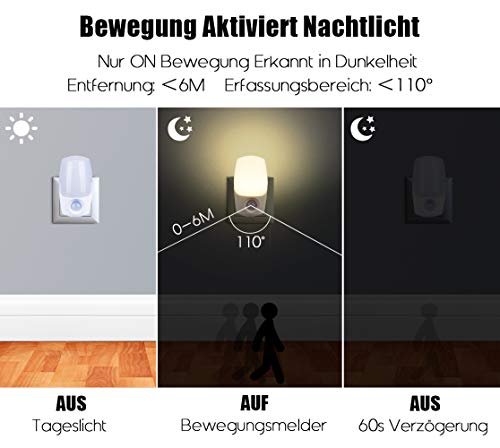 [On/Off automatico]: intelligente incorporato, sensore di movimento e sensore crepuscolare ecologici, si accende automaticamente la luce, quando viene rilevato il movimento entro 3 m ~ 6 m di notte, e si spegne dopo S ritardo se non viene rilevato alcun movimento. Questa luce notturna attivata solo in buio e si spegne, se la vostra stanza di luce solare erhellt o eccessivamente illuminato.