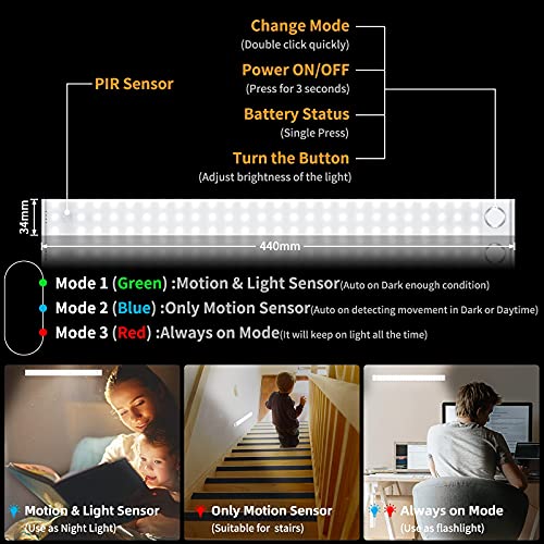 【4 modalità ciclo e ricaricabile】 Modalità 1: modalità sensore di movimento e luce (indicatore verde lampeggia 1 s);